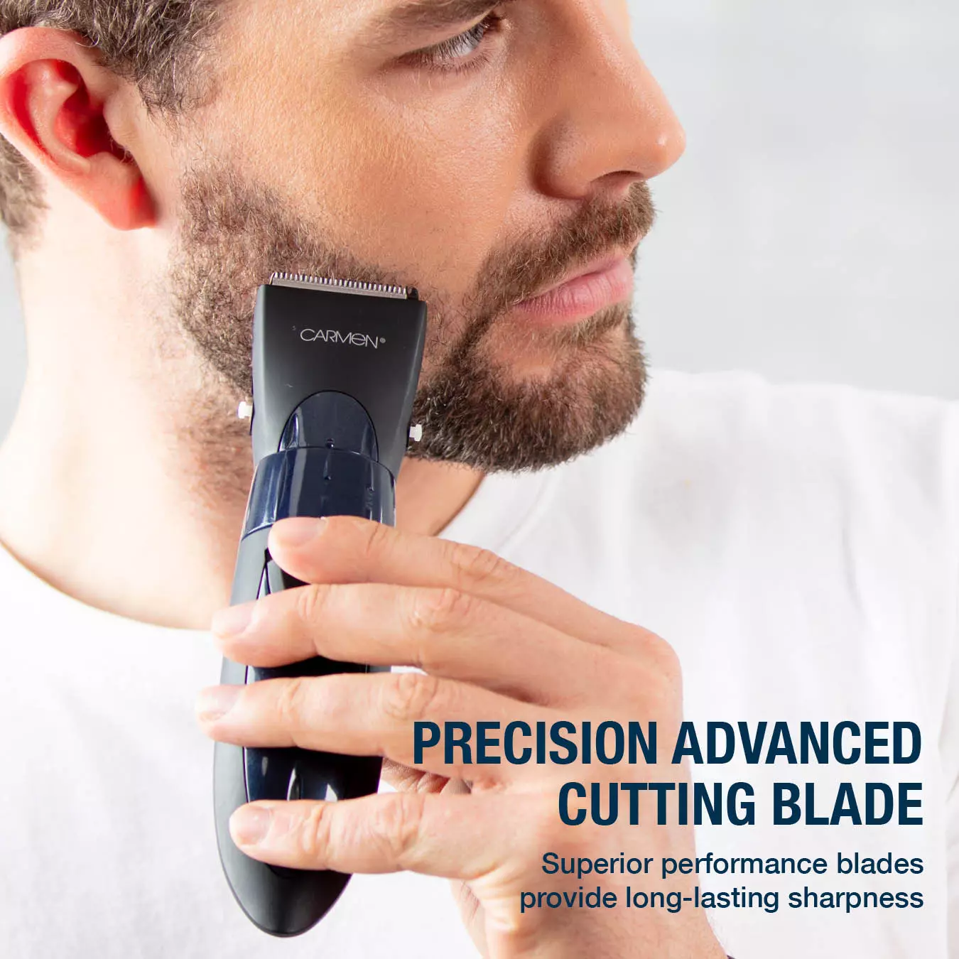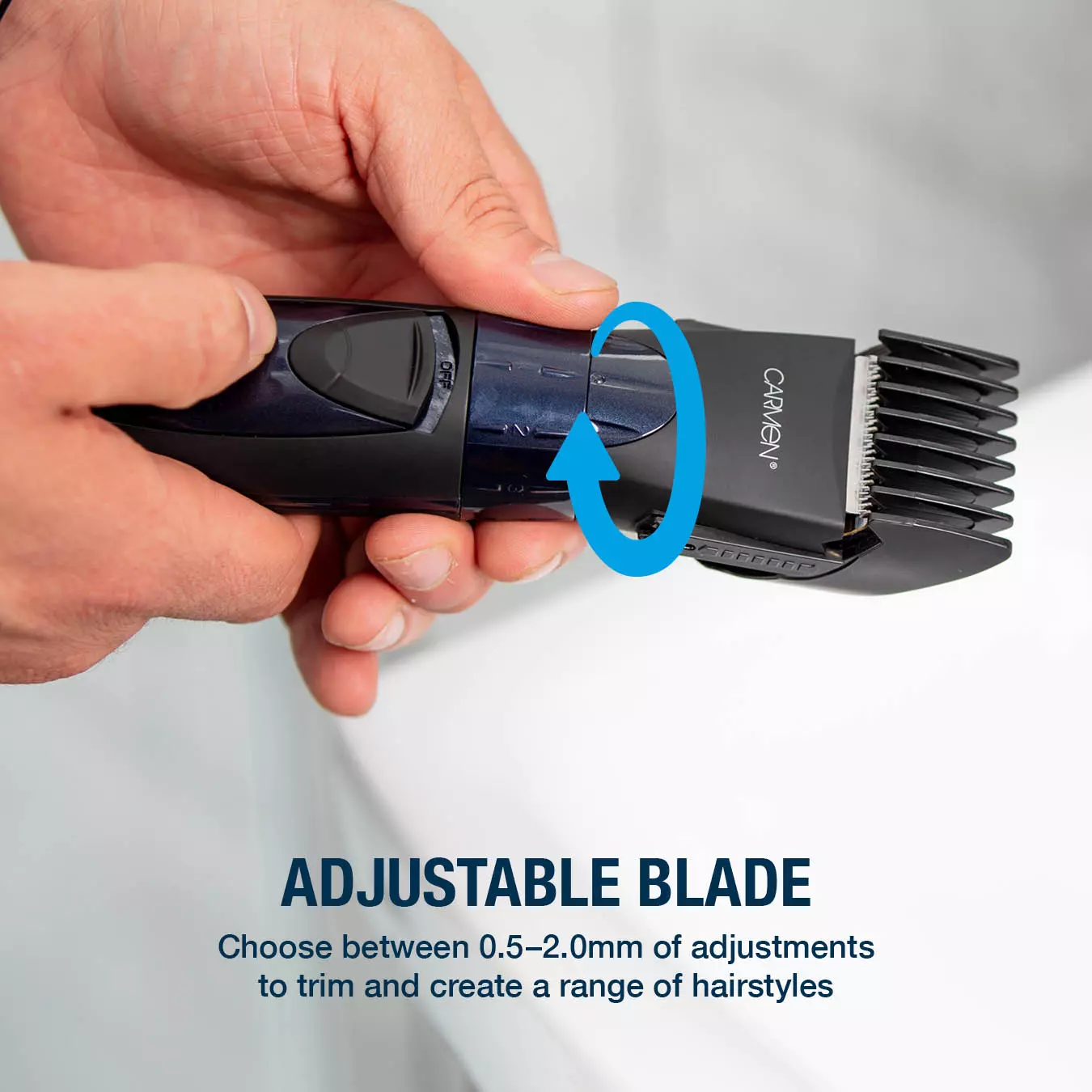 Create a professional quality cut at home with the Carmen Signature Men’s Cordless Hair Trimmer. Features 5 cutting lengths from 4-16mm to suit every style, providing ultimate versatility for face and body grooming, with additional built-in adjustable device to give you total control over your cut.