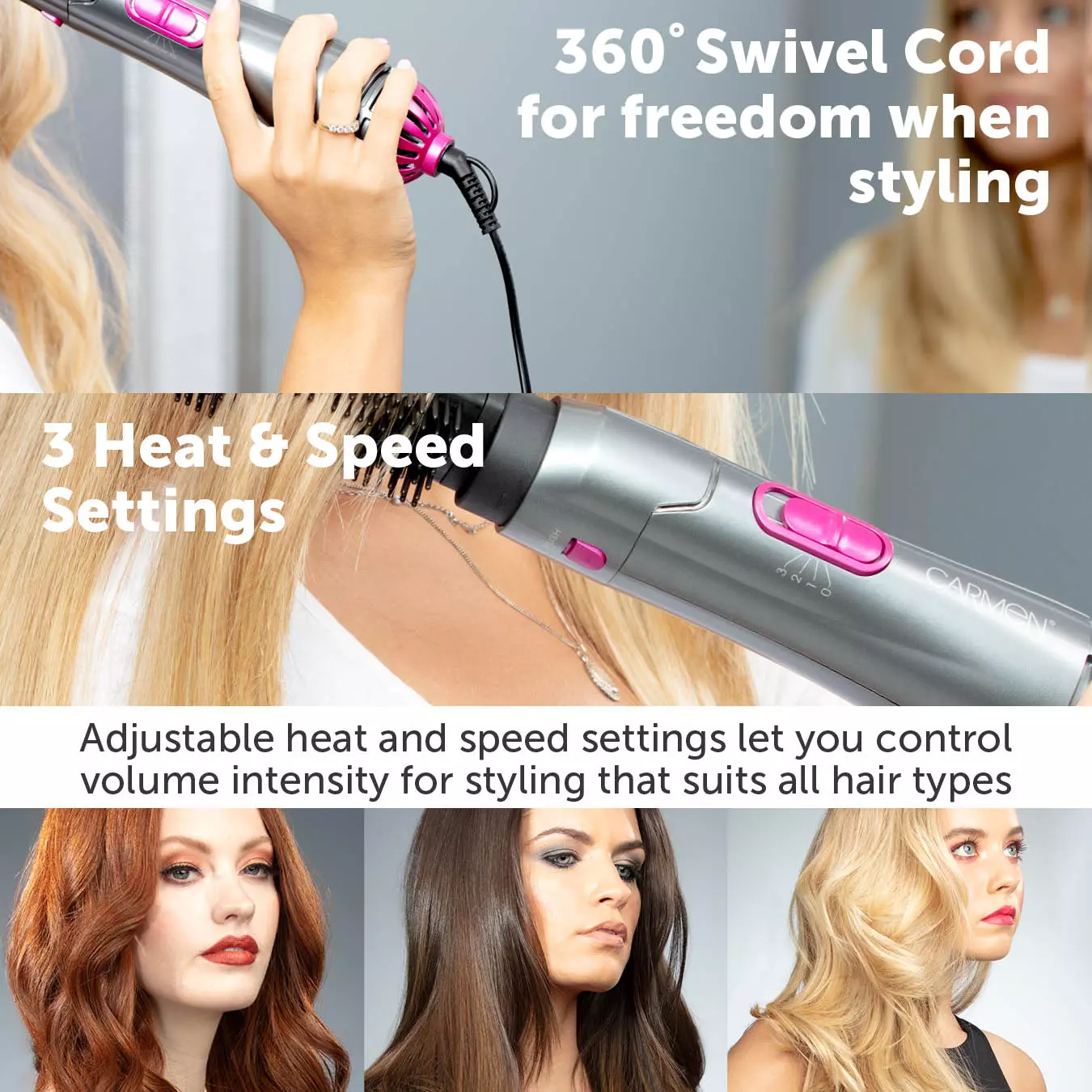 It also includes a dryer brush and concentrator nozzle for precision styling. Carmen's protech keratin-infused rotating barrel conditions your hair with healthy proteins to prevent damage from repeat styling, adding shine as it naturally glides through your hair. Heat and speed settings can be adjusted to suit any hair type to enhance definition and shape, with a cool shot function to lock your look in place. Features a 360-degree swivel cord for freedom while styling.