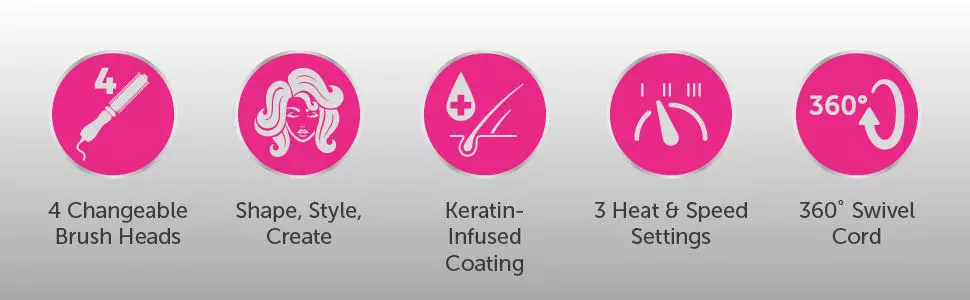 Comes with a 33mm round brush for making waves, 19.5mm thermal bristle brush for creating tight curls, flat paddle brush for smoothing and straightening, as well as a dryer brush with concentrator nozzle