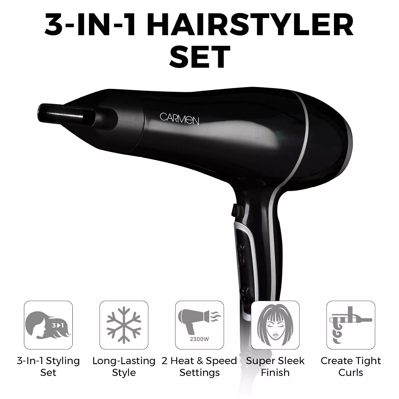 Achieve beautiful blow dries, silky straight hair and natural curls with the Carmen 3-in-1 styling set