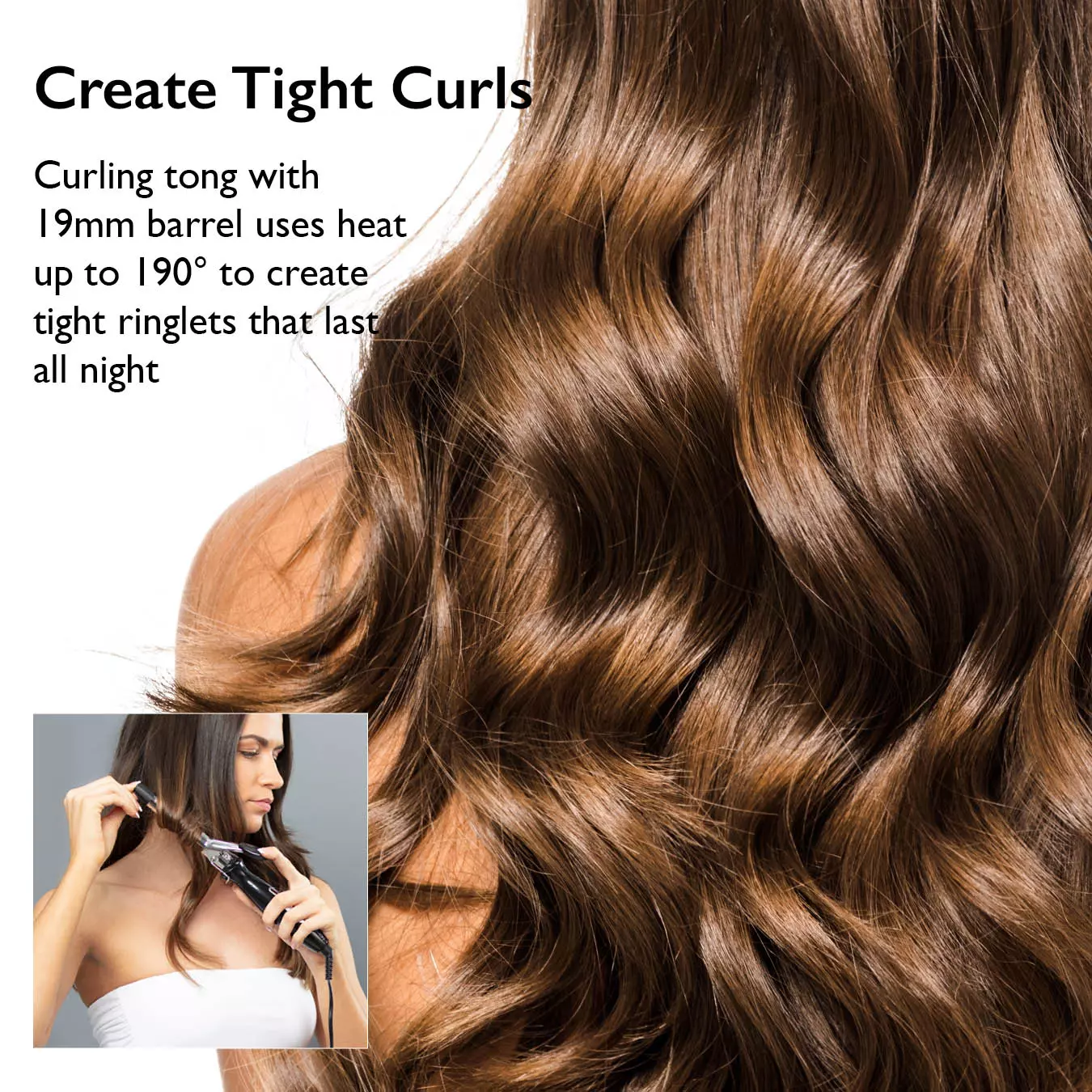 Curling tong uses high heat up to 190 degrees with 19mm barrel for creating tight ringlets that last all night