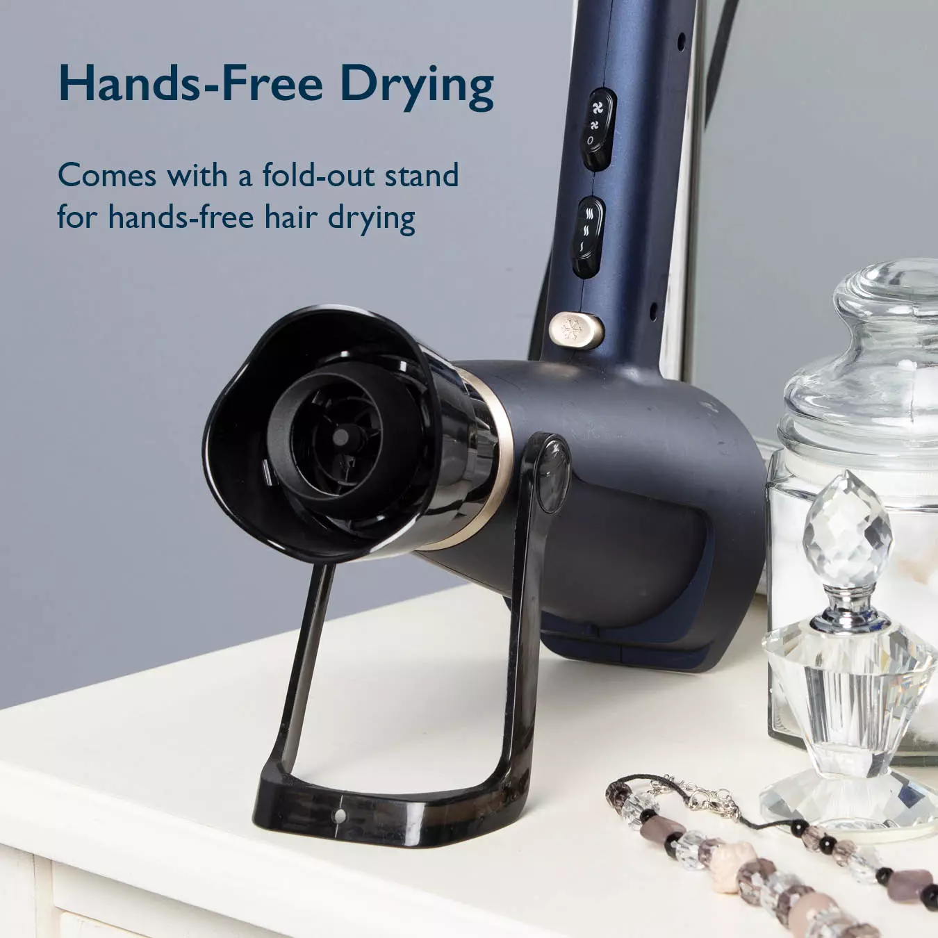 Styling is made simple with the fold-out stand letting you use both hands to brush hair while blow-drying