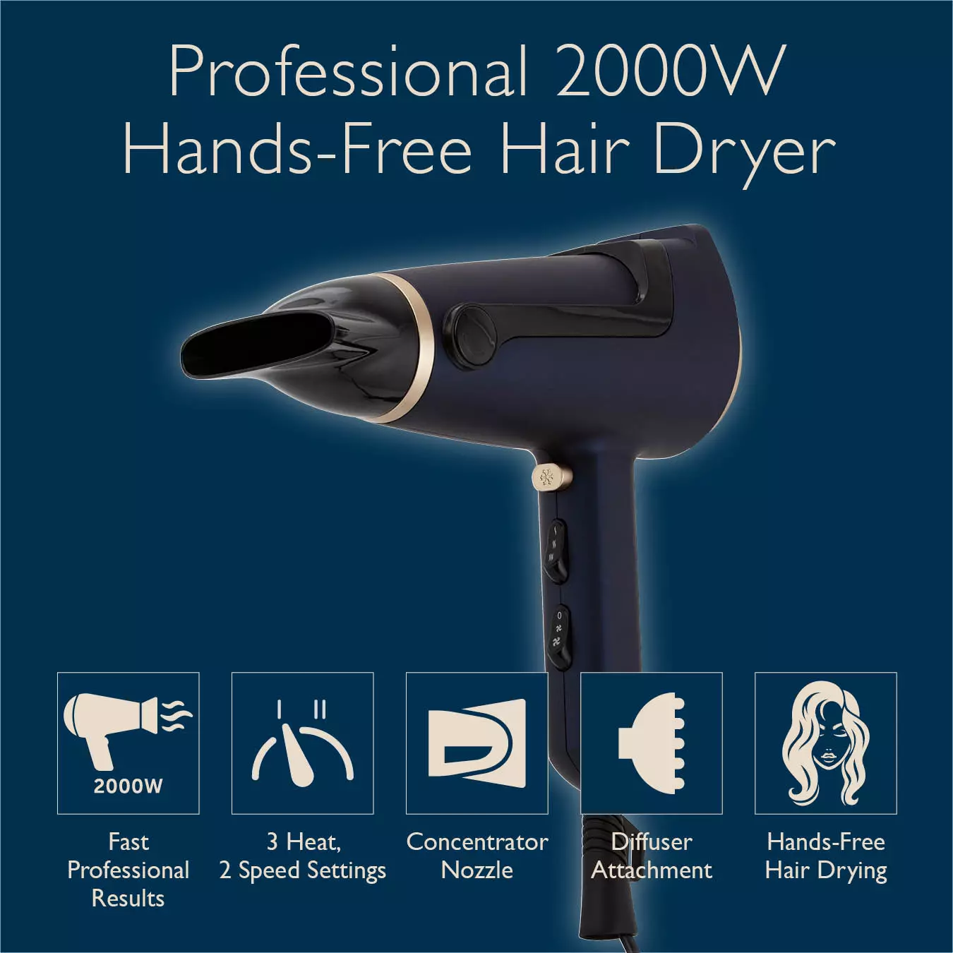 Introducing salon-styled hair made simple with the Carmen Twilight hands-free hair dryer. Sitting securely on your table, desk or dresser, the fold-out stand lets you use both hands to brush while you blow dry, taking the struggle out of regular styling. It uses three heat settings to dry wet hair without the work, including a cool shot function to set your look in place for longer. The included air wave diffuser distributes air over a wider area, enhancing your curls and waves while eliminating frizz with a flawless finish. Giving you more control over your look, the concentrator nozzle attachment directs airflow onto sectioned hair to build volume for salon-defined styling. Its removable filter lets you easily remove caught hairs and lint to maintain powerful performance through every blow dry, with a handy hanging loop to tidy away when you're done drying.