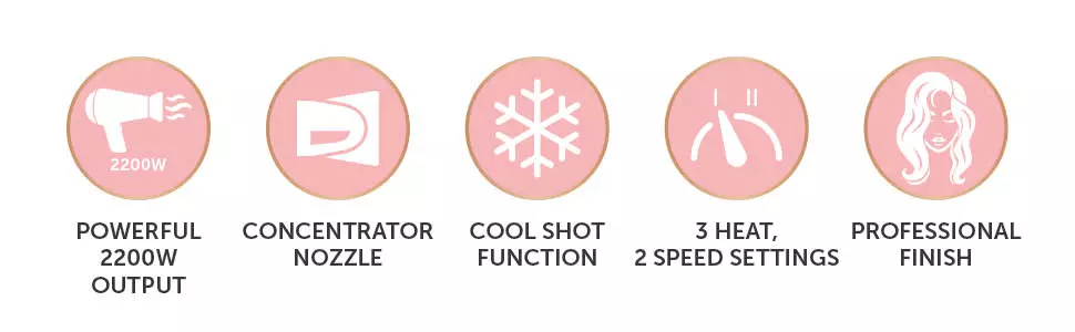 Powerful 2200W for a speedy blow drySuitable for all hair types and styles with 2 speeds and 3 heats