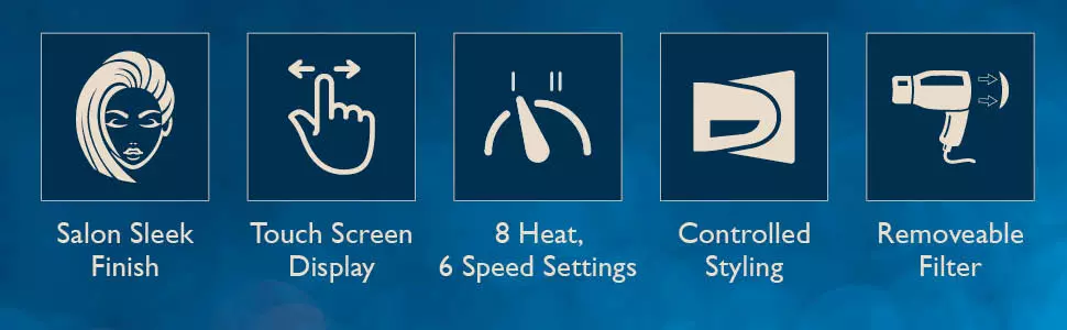 LED digital display with touch screen on handle for ultra-easy useIncludes a concentrator nozzle for precise styling