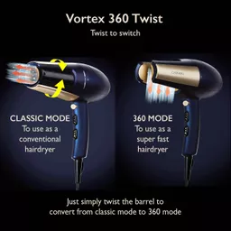 60 percent faster drying with the ultimate 2 in 1 hair dryerSimple twist to switch to 360 mode for fast drying and less damage