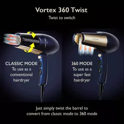Simply twist the barrel to switch from classic mode and use as a conventional hairdryer, to 360 mode to use as a super-fast blow dryer, for luscious locks in an instant