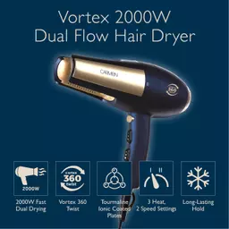 Reinvent your styling routine with faster drying, fuller coverage and a straighter finish using the Vortex Dual Flow Hairdryer. Twist the barrel to reveal the powerful dual air jets that dry both the front and back of your hair at the same time, resulting in quicker drying while preventing damage from overheating. Simply place sectioned hair into the air chamber and work the dryer over your hair to naturally straighten as you dry, helping you achieve a sleek and straighter hairstyle without the need for a second appliance. The tourmaline ionic-coated plates produce a stream of negative ions to combat frizz while drying, giving your hair a brilliant boost in shine and smoothing over your strands to make styling more manageable. Switch to the traditional drying mode by twisting back the barrel to add those flawless finishing touches, using conventional forward-motion airflow to lift your roots and build volume for a beautifully-defined look. The ultra-quiet AC motor makes less noise during use, making this hairdryer perfect for early morning and late night styling without disturbance. The hairdryer has 3 heat and 2 speed settings to comfortably style any hair type with a smooth, glossy finish, complete with a cool shot function to secure your style in place for a long-lasting blow dry.