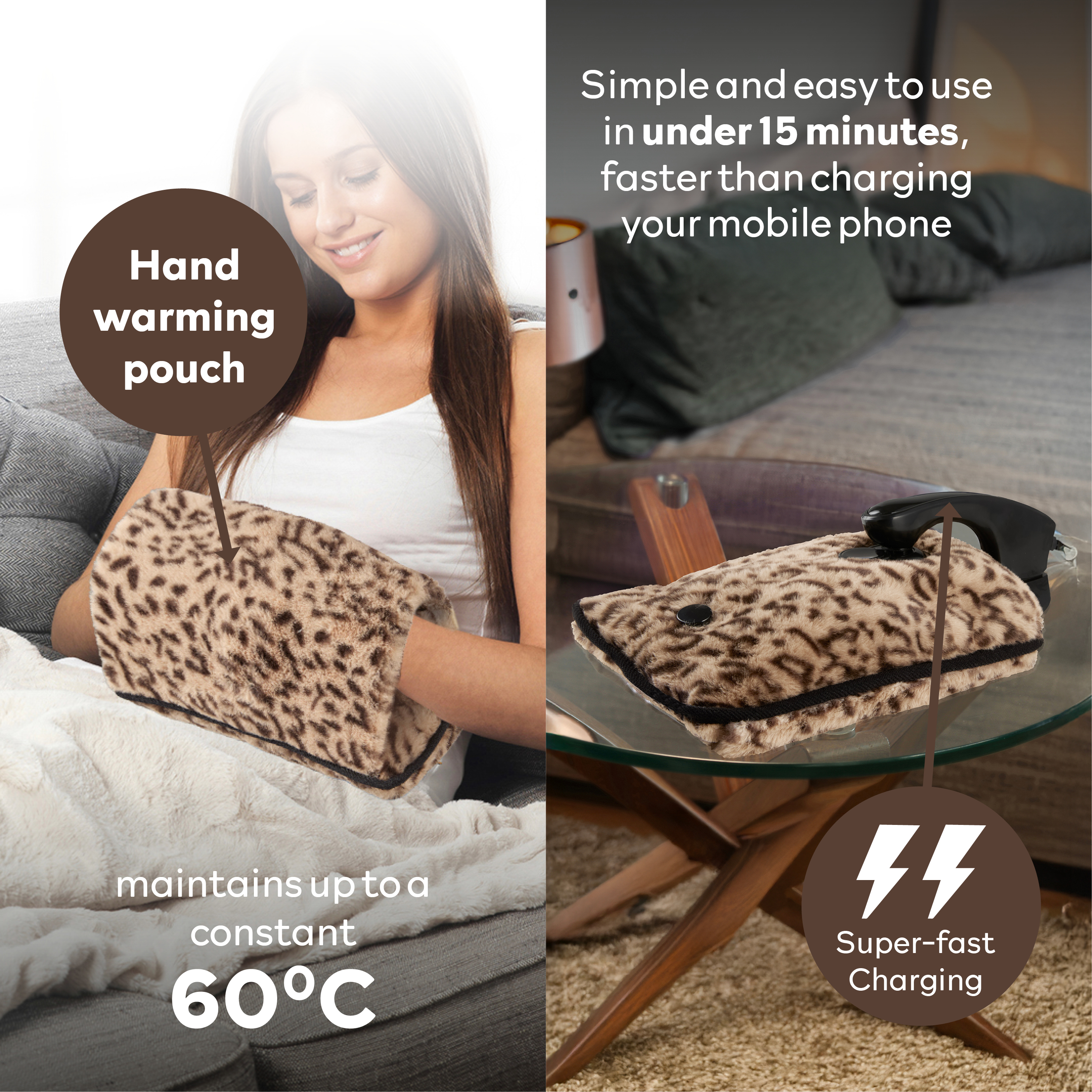 This stylish faux fur leopard print rechargeable hot water bottle comes pre-filled with water and is permanently sealed so you never have to worry about refilling, leaks or scalding from boiling water.