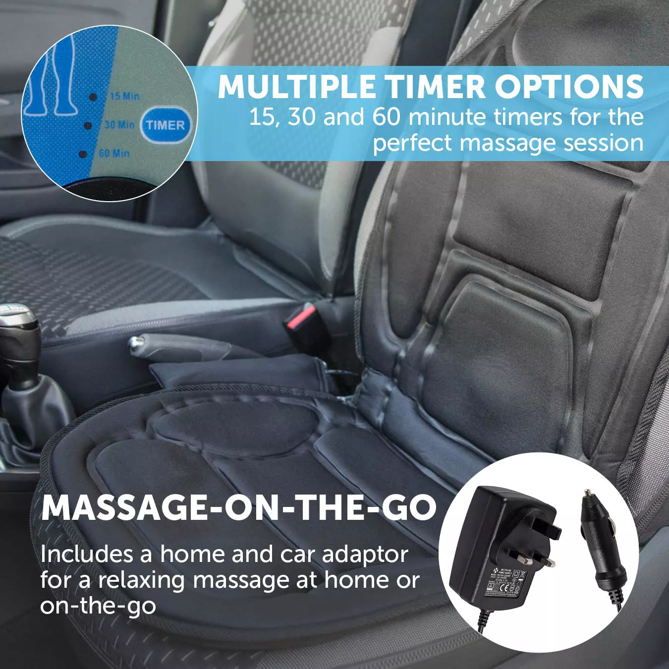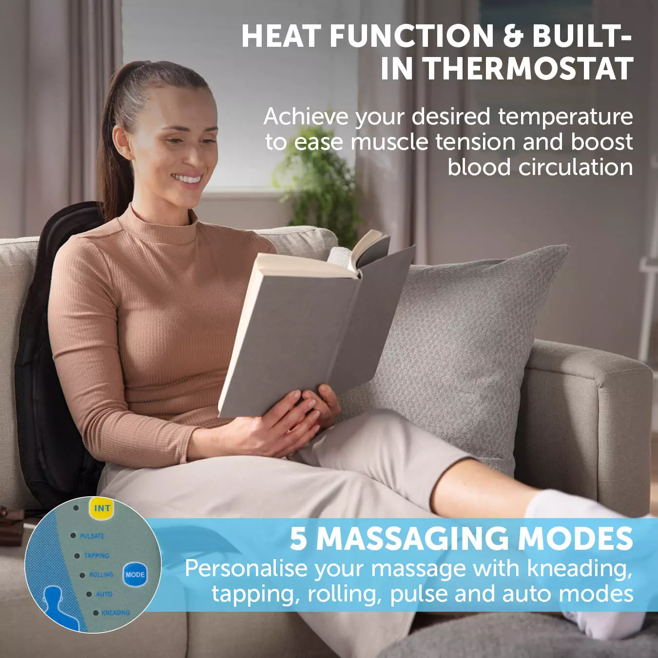 Built-in heat function and thermostat allows you to achieve your desired temperature and target specific areas to ease muscle tension and stress, as well as promoting better blood circulation after a long, busy day. Use the remote control to personalise your massage at the touch of a button - choose from kneading, tapping, rolling, pulse and auto modes. Choose from 15, 30 and 60 minute timer options to give you complete control over your massage session. Includes a home and car adaptor for a relaxing massage at home or on-the-go, so you can ease tension and stress wherever you are.