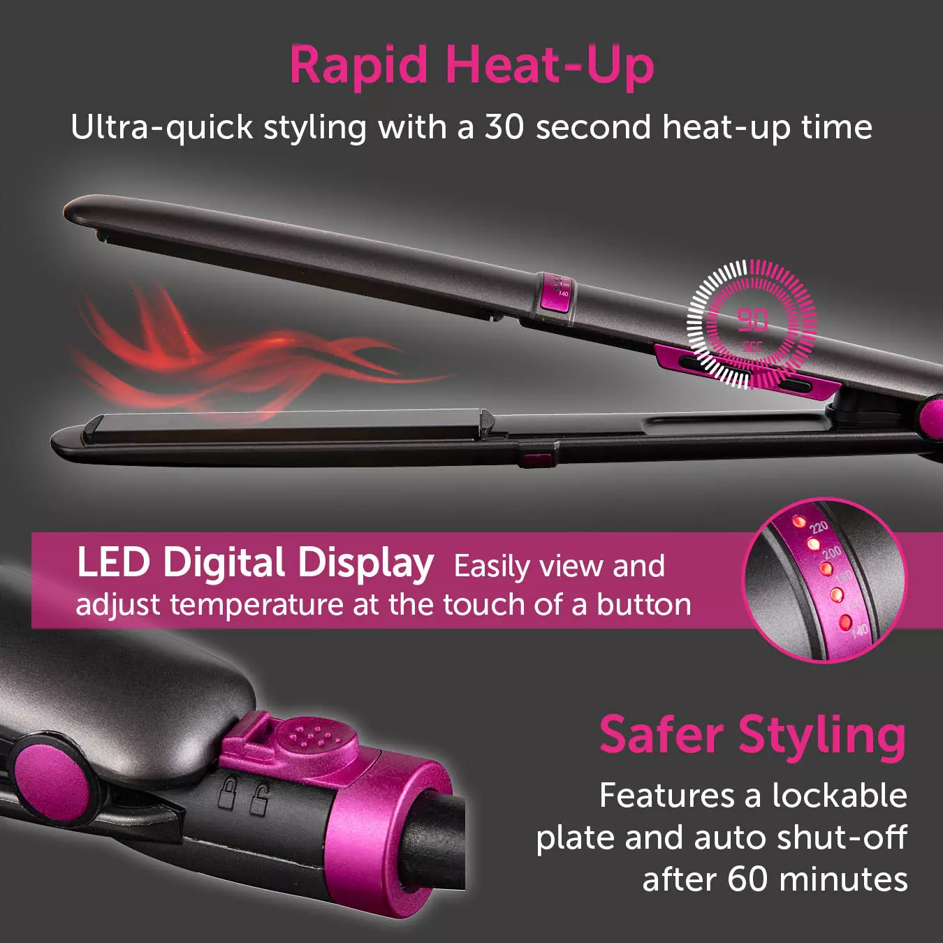 The plates heat up from 140-220 degrees to smooth out delicate strands and iron out kinks from thicker hair. Easily view and adjust the temperature at the touch of a button using the LED digital display, so you can set the straightener to your desired heat level with ease and start styling. It features a lockable plate for easy transport and storage, with auto shut-off after 60 minutes for added peace of mind.