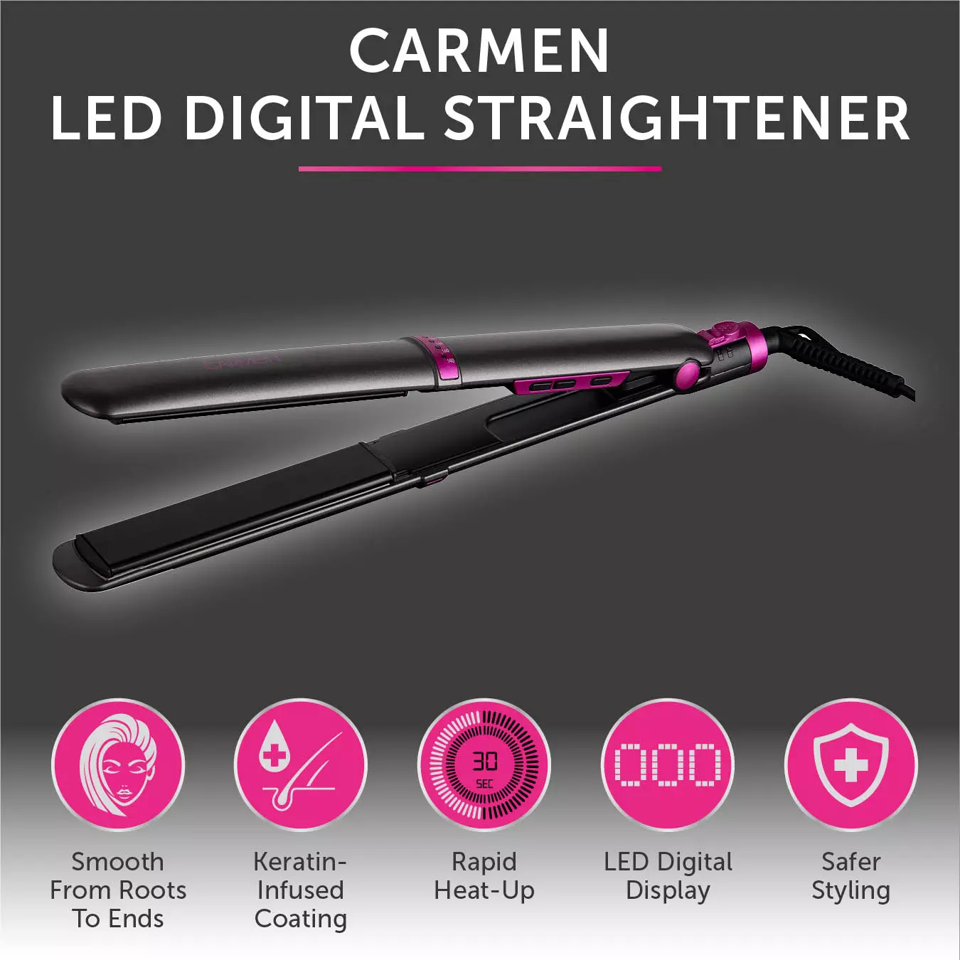 Create salon-quality, sleek styles with the Carmen Neon LED Digital Hair Straightener. You can start styling in an instant with a 30-second heat-up time, for looks that last all day long. Carmen's own advanced ceramic coating transfers keratin to hair, conditioning and preventing heat damage for hair that looks and feels healthier.