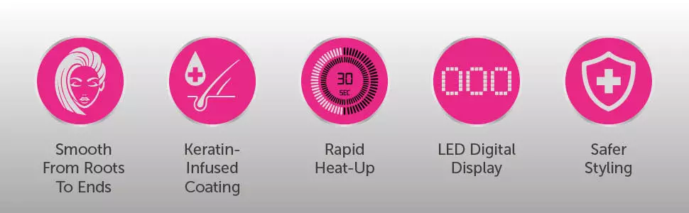 Ceramic coating infused with Keratin for shiny and healthy hairUltra-quick styling with 30 second heat up time
